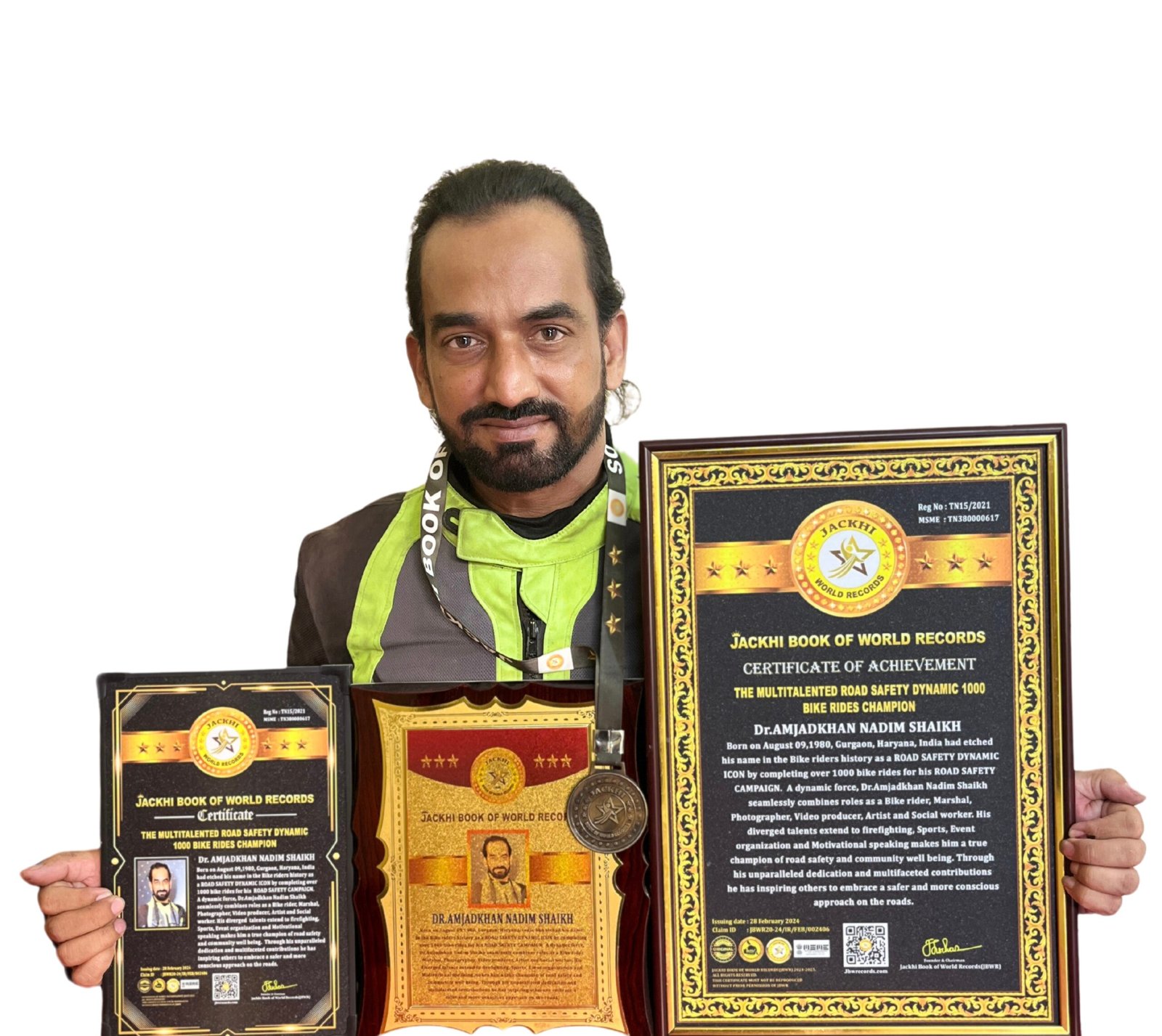 Dr. AMJADKHAN NADIM SHAIKH, Born on August 09,1980, Gurgaon, Haryana, India had etched his name in the Bike rider's history as a ROAD SAFETY DYNAMIC ICON by completing over 1000 bike rides for his ROAD SAFETY CAMPAIGN. A dynamic force, Dr.Amjadkhan Nadim Shaikh seamlessly combines roles as a Bike rider, Marshal, Photographer, Video producer, Artist and Social worker. His diverged talents extend to firefighting, Sports, Event organization and Motivational speaking makes him a true champion of road safety and community well being. Through his unparalleled dedication and multifaceted contributions he has inspiring others to embrace a safer and more conscious approach on the roads.