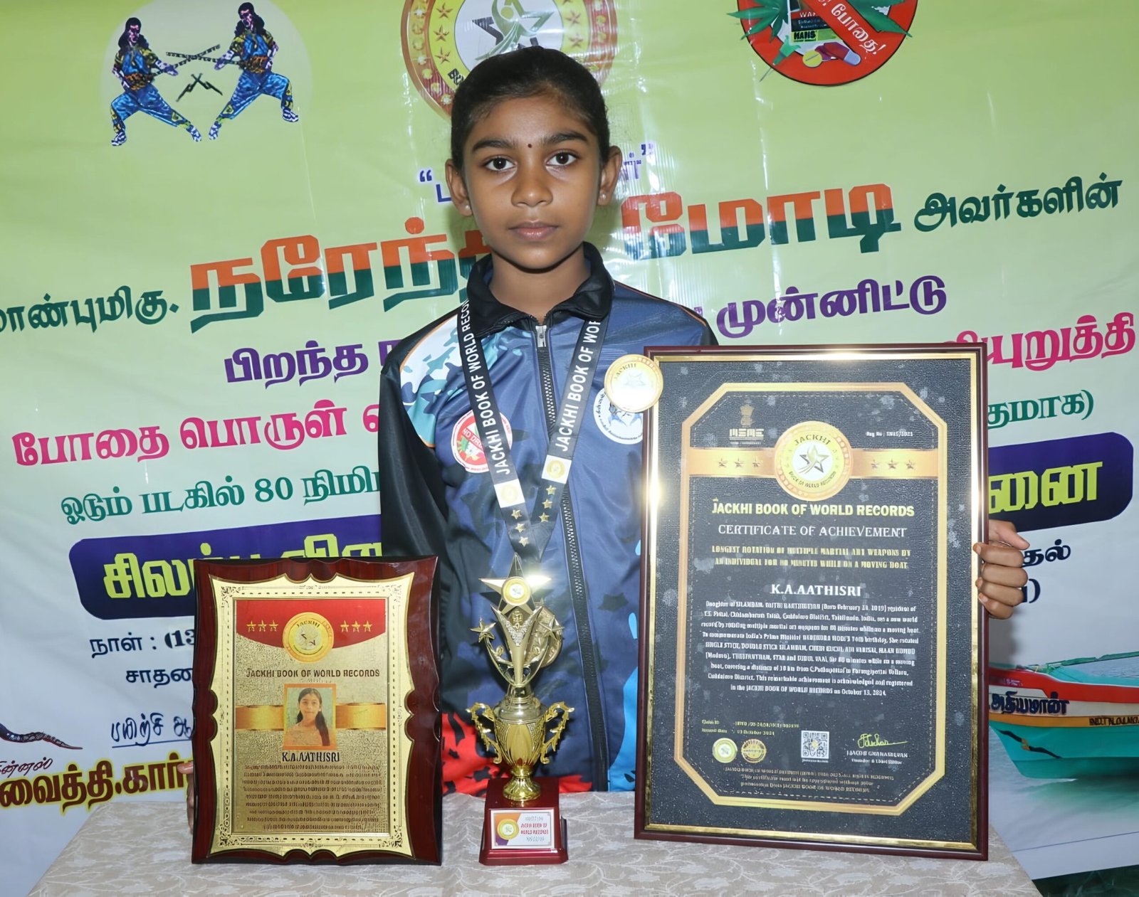 Daughter of SILAMBAM. VAITHI KARTHIKEYAN (bborn February 24, 2019), resident of T.S. Pettai, Chidambaram taluk, Cuddalore district, Tamil Nadu, India, set a new world record by rotating multiple martial art weapons for 80 minutes while on a moving boat. To commemorate India's Prime Minister NARENDRA MODI'S 74th birthday, She rotated SINGLE STICK, DOUBLE STICK SILAMBAM, CHEDI KUCHI, ADI VARISAI, MAAN KOMBU (Maduvu), THEEPANTHAM, STAR, and SURUL VAAL for 80 minutes while on a moving boat, covering a distance of 10 km from C.Puthupettai to Parangipettai Vellaru, Cuddalore district.