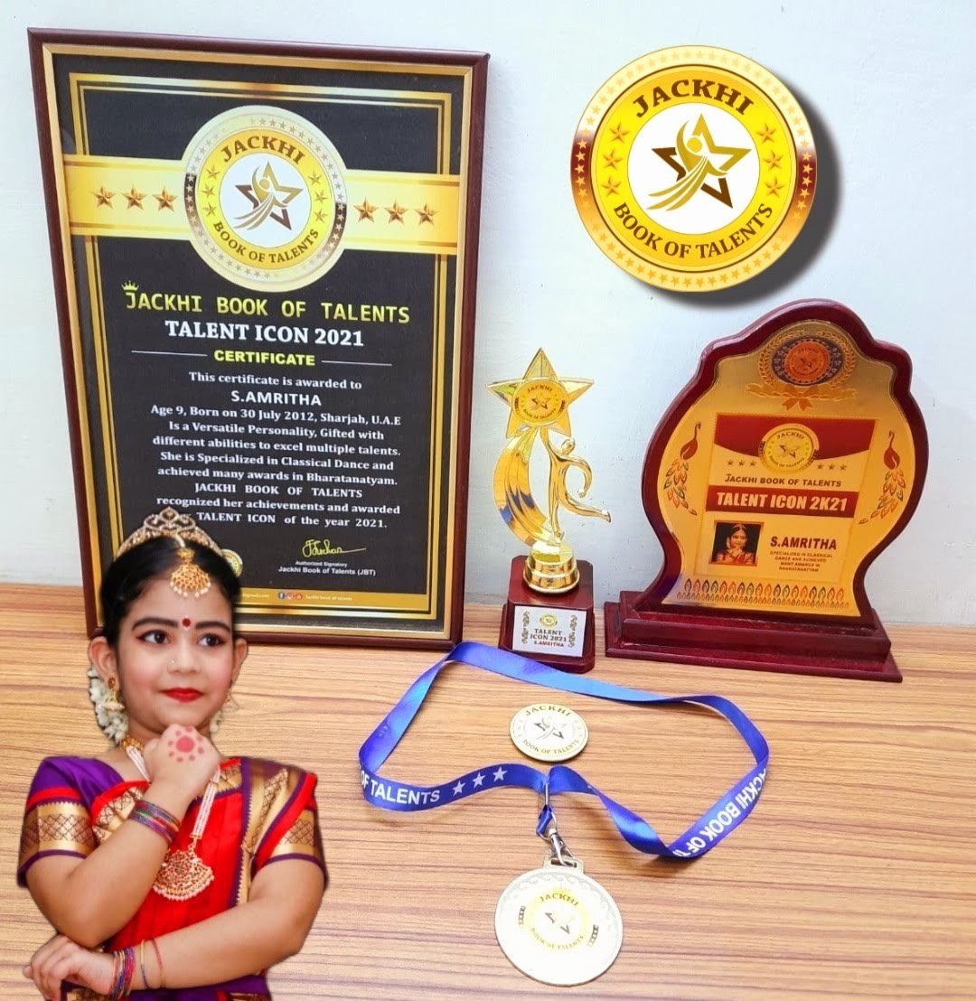 S.AMRITHA ,Age 9, Born on 30 July 2012,Sharjah, U.A.E is a versatile personality, gifted with different abilities to excel multiple talents. She is Specialized in Classical Dance and achieved many awards in Bharathanatyam.