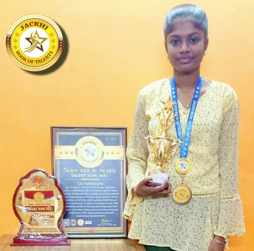 S.B.THANSEEGHA, Age 12, Born on 15th April 2009, Chennai, Tamilnadu, India, Is a multifaceted kid, who had been excel her talent in Abacus, Photography, News Reading, Story telling, Origami, Karate, Yoga, Singing and Drawing. She had achieved Winner certificate in NATIONAL LEVEL Spell Bee, RASHTRAGAAN Award from Ministry of Culture, Government of India, STAR PERFORMER AWARD for Reading and writing competition, Rank 1st in Prathmic Examination and avtively participated in Science Olympiad ,MASS WORLD RECORD EVENTS.