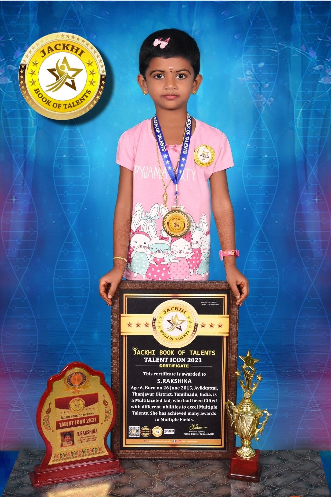 S.RAKSHIKA, Age 6, Born on 26 June 2015, Thanjavur, Tamilnadu ,India. is a Multifaceted Kid, Who had been Gifted with different abilities to excel multiple talents. She has achieved many awards in Multiple fields.