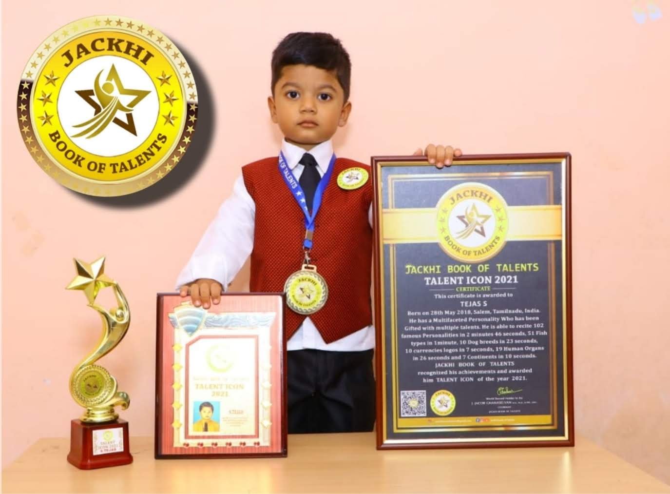 S.Tejas, Born on 28th May 2018, Salem, Tamilnadu. He has multifaceted personality who has been gifted with multiple talents. He is able to recite 102 famous personalities in 2minutes 46 seconds, 51 Fish types in 1minute, 10 dog breeds in 23 seconds, 10 currencies logos in 7 seconds, 19 Human Organs in 26 seconds and 7 Continents in 10 seconds.