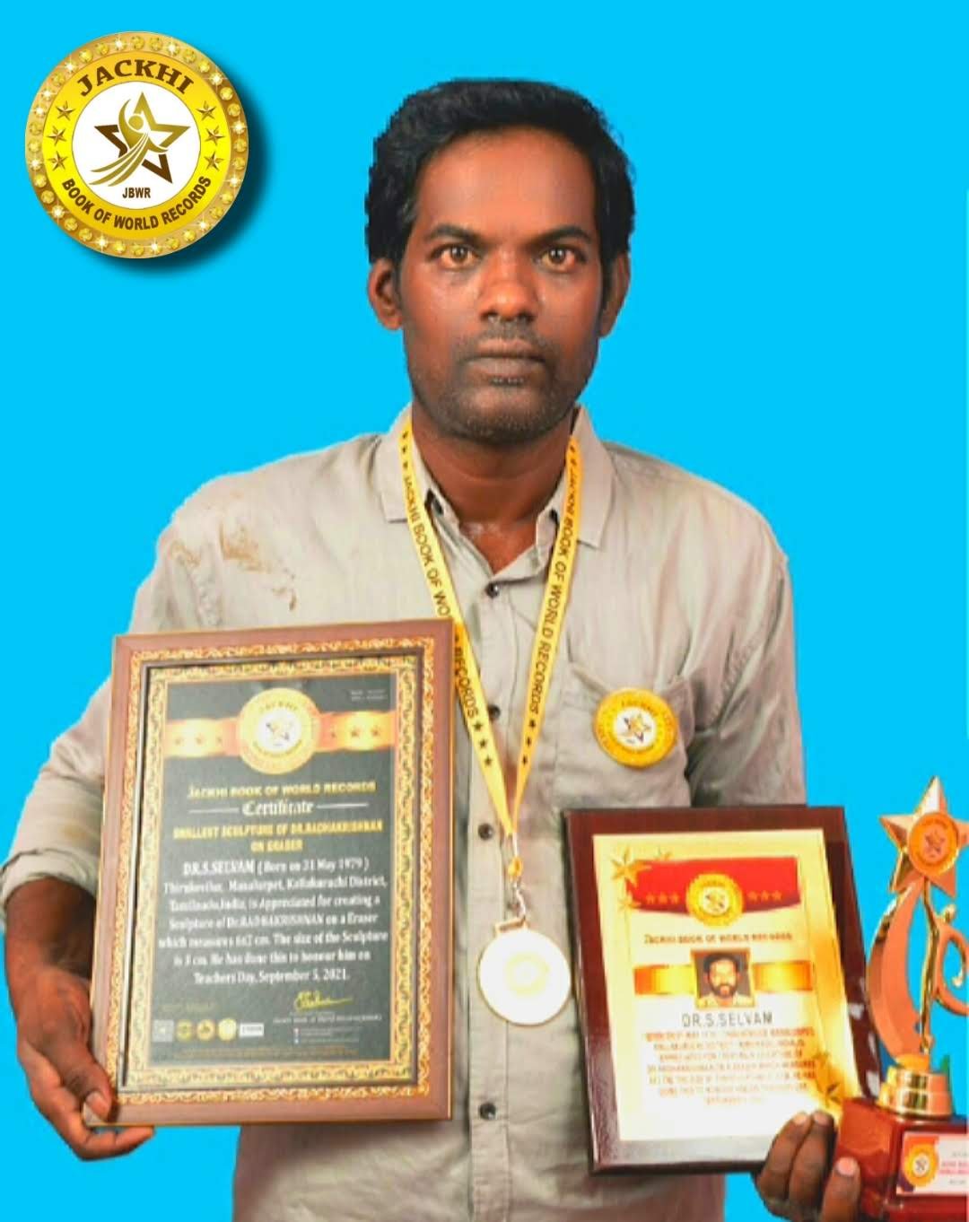 DR.S.SELVAM, Born on 31 May,1979, Thirukovilur, Kallakurichi District, Tamilnadu, India is appreciated for creating a Sculpture of Dr.RADHAKRISHNAN on a Eraser which measures 6x 2 cm. The size of the Sculpture is 3cm. He has done this to hounour him on teachers day, September 5,2021.