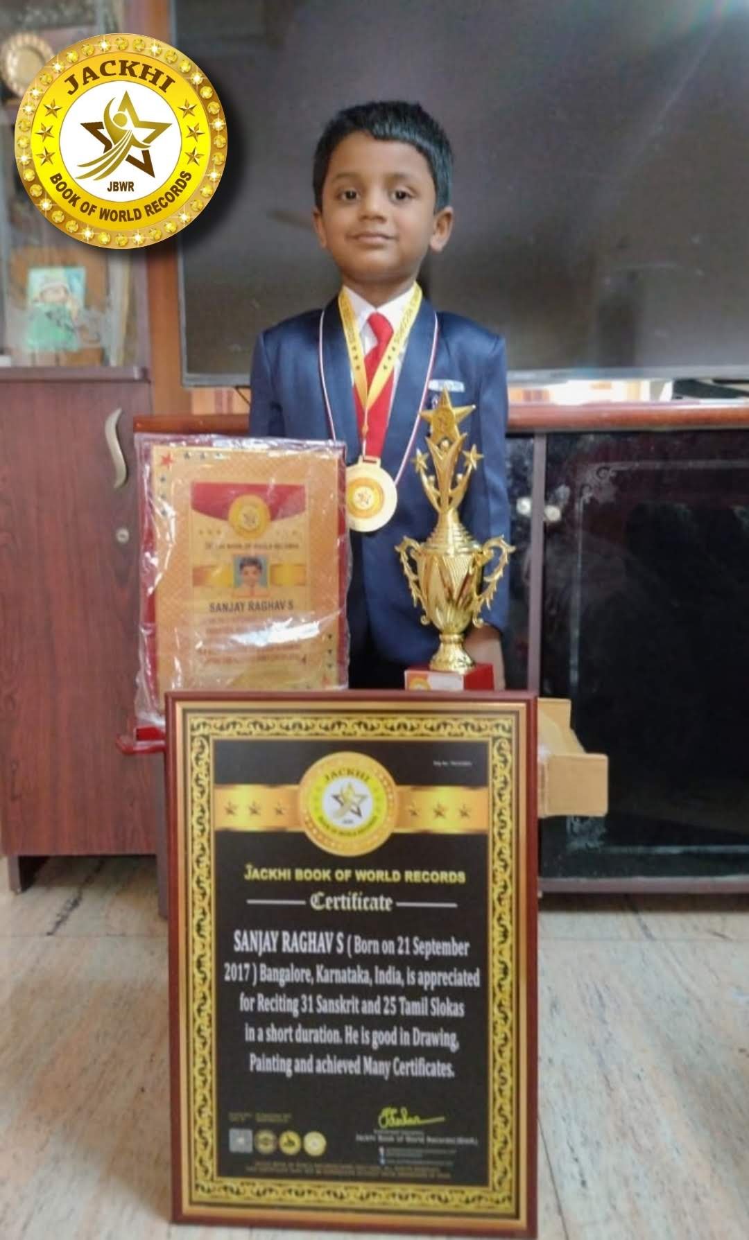 SANJAY RAGHAV S - Born on 21 September 2017, Bangalore Karnataka, India is Appreciated for Reciting 31 Sanskrit and 25 Tamil Slokas in a short duration. He is good in Drawing, Painting and achieved various certificates.