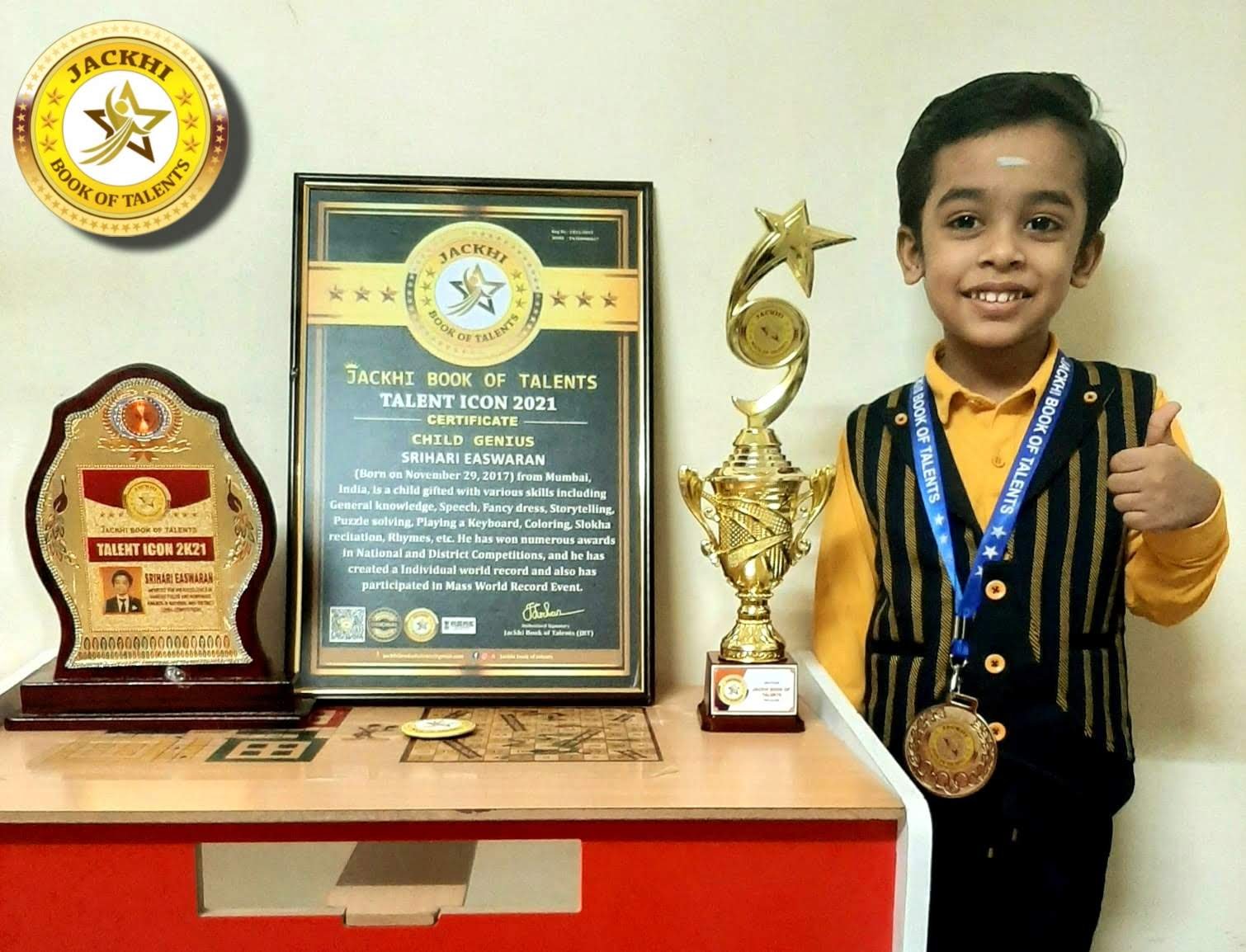 SRIHARI EASWARAN (Born on November 29, 2017) from Mumbai, India, is a child gifted with various skills including General knowledge, Speech, Fancy dress, Storytelling, Puzzle solving, Playing a Keyboard, Coloring, Slokha recitation, Rhymes, etc. He has won numerous awards in National and District Competitions, and he has created a Individual world record and also has participated in Mass world record event.