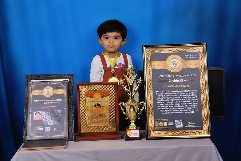 SONVI A REDDY, Born on 06 August 2020, Anekal Taluk, Bengaluru, Karnataka, India is a Genius kid who has Identified 100 Objects, 27 country flags, 27 freedom fighters, 20 wild animals, 20 pet animals, 20 Birds, 20 fruits, 15 car logs,15 Vegetables, 12 famous personalities ,12 vehicles,11 flowers, 11 insects, 11 community helpers, 10 food items, 10 parts of the body, 8 goddess, 7 sea animals name, 6 national symbols and identifying rooms. Recited