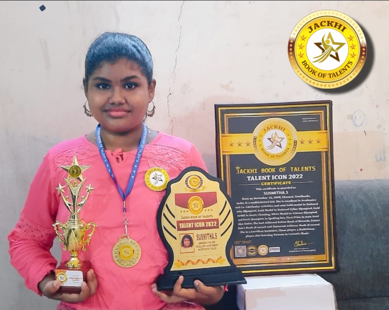 SUSHMITHA, Born on November 16, 2008, Chennai, Tamilnadu, India is a multifaceted kid. She is excellent in Academics and Co- Curricular activities and won Gold medal in National Maths Olympiad, Gold Medal in National Cyber Olympiad, Gold Medal in Geeta Chating, Silver Medal in Science Olympiad, Zonal level champion in Spelling Bee, First Prize in state level Ilakiya Sudar. She had achieved Kalam Book of records, Future Kalam's Book of record and Universal achievers Book of record. She is a excellent Swimmer, Chess player and a Badminton player, she is a learner of Varnam in Carnatic music.