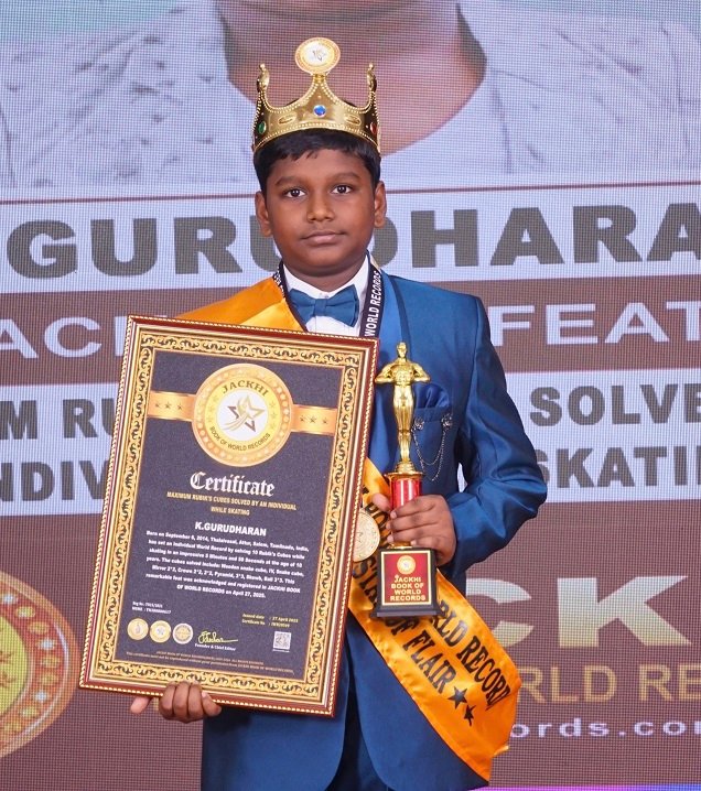 K. GURUDHARAN, born on September 6, 2014,Thalaivasal, Attur, Salem, Tamilnadu, India, has set an Individual World Record by solving 10 Rubik's cubes while skating in an impressive 5 minutes and 50 seconds at the age of 10 years. The cubes solved include: Wooden snake cube, IV, Snake cube, Mirror 22, Crown 2 x 2, 2 x 2, Pyramid, 3 x 3, Skewb, Ball 3 x 3.