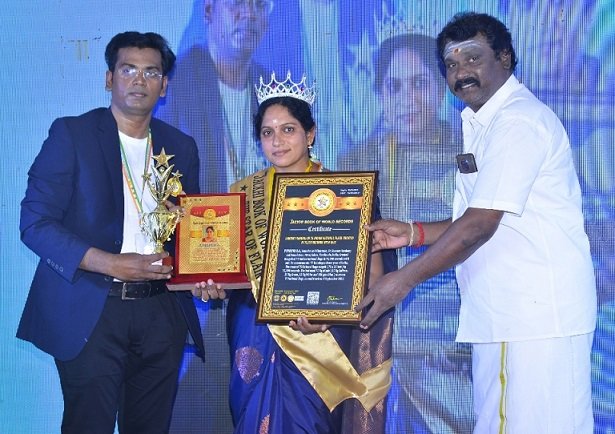 P.PARIMALA, Founder and Chairman, Sri Success Academy and Foundation, Attur, Salem, Tamilnadu, India. Created Rangoli of 75 Indian National flags in 75,000 seconds with salt. To commemorate 75 th Independence year of India, She created 75 National flags rangoli (75 x 25 feet ) in 75,000 seconds. She had used 75 Kg of salt ( 25 Kg Saffron ,25 Kg Green, 25 Kg White and 250 gms Blue) to create 75 National flags, as confirmed on 8 September 2022.