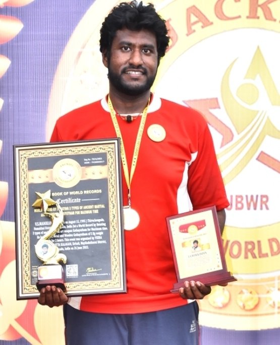 V.S.MANIKANDEN, Born on August 15, 1995, Thiruchengode, Namakkal District, Tamilnadu, India Set a World Record by Rotating 2 types of ancient Martial art weapon Gathayutham for Maximum time. He had rotated Metal and Wooden Gathayutham of 5 Kg weight relentlessly for 2 hours. This event was organized by VEERA THAMILAR SILAMBATTA KALAGAM, Sirkali, Mayiladuthurai District, Tamilnadu, India on 26 June 2022.