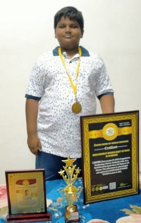 C.MATHI, Born on June 29, 2010 ,Aruppukottai, Virudhunagar District, Tamilnadu, India, Set a World Record by Speak about 100 Topics in 100 Minutes. This achievement is acknowledged and registered in JACKHI BOOK OF WORLD RECORDS on June 8, 2022.