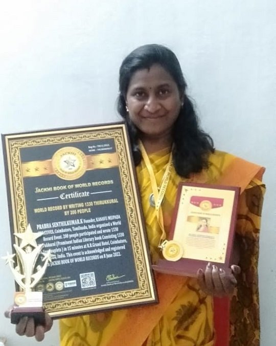 PRABHA SENTHILKUMAR.K Founder, KANAVU MEIPADA CREATIVES, Coimbatore, Tamilnadu, India organized a World Record Event. 200 people participated and wrote 1330 Thirukkural (Prominent Indian Literary book Consisting 1330 two line couplets ) in 15 minutes at R.R.Grand Hotel, Coimbatore, Tamilnadu,India. This event is acknowledged and registered in JACKHI BOOK OF WORLD RECORDS on 8 June 2022.