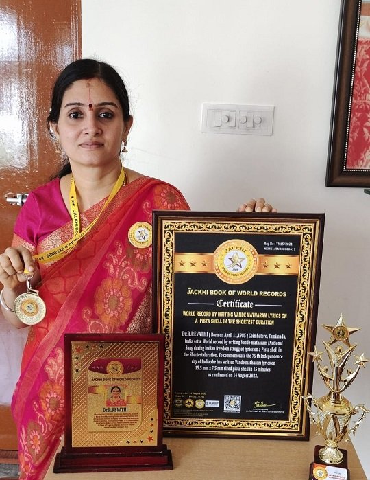Dr.R.REVATHI, Born on April 11,1985, Coimbatore, Tamilnadu, India set a World record by writing Vande matharam (National Song during Indian freedom struggle) lyrics on a Pista seed in the Shortest duration. To commemorate the 75 th Independence day of India she has written Vande matharam lyrics on 15.5 mm x 7.5 mm sized pista seed in 15 minutes as confirmed on 14 August 2022.