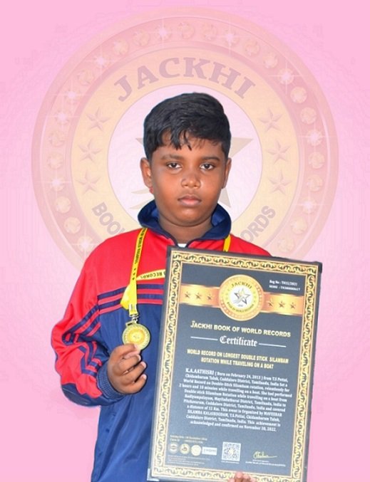 K.A.ATHIYAMAN, Born on January 15, 2011 from T.S Pettai, Chidambaram Taluk, Cuddalore District, Tamilnadu, India Set a World Record by Rotating Two- Handed Double-Stick Silambam rotation relentlessly for 2 hours and 10 minutes while travelling on a boat. He had performed Double-Handed Silambam Rotation from Kodiyampalayam, Mayiladuthurai District, Tamilnadu, India to Pitchavaram, Cuddalore District, Tamilnadu, India and covered a distance of 12 Km. This event is Organized by MAVEERAR SILAMBA KALAIKOODAM, T.S.Pettai, Chidambaram Taluk, Cuddalore District, Tamilnadu, India.