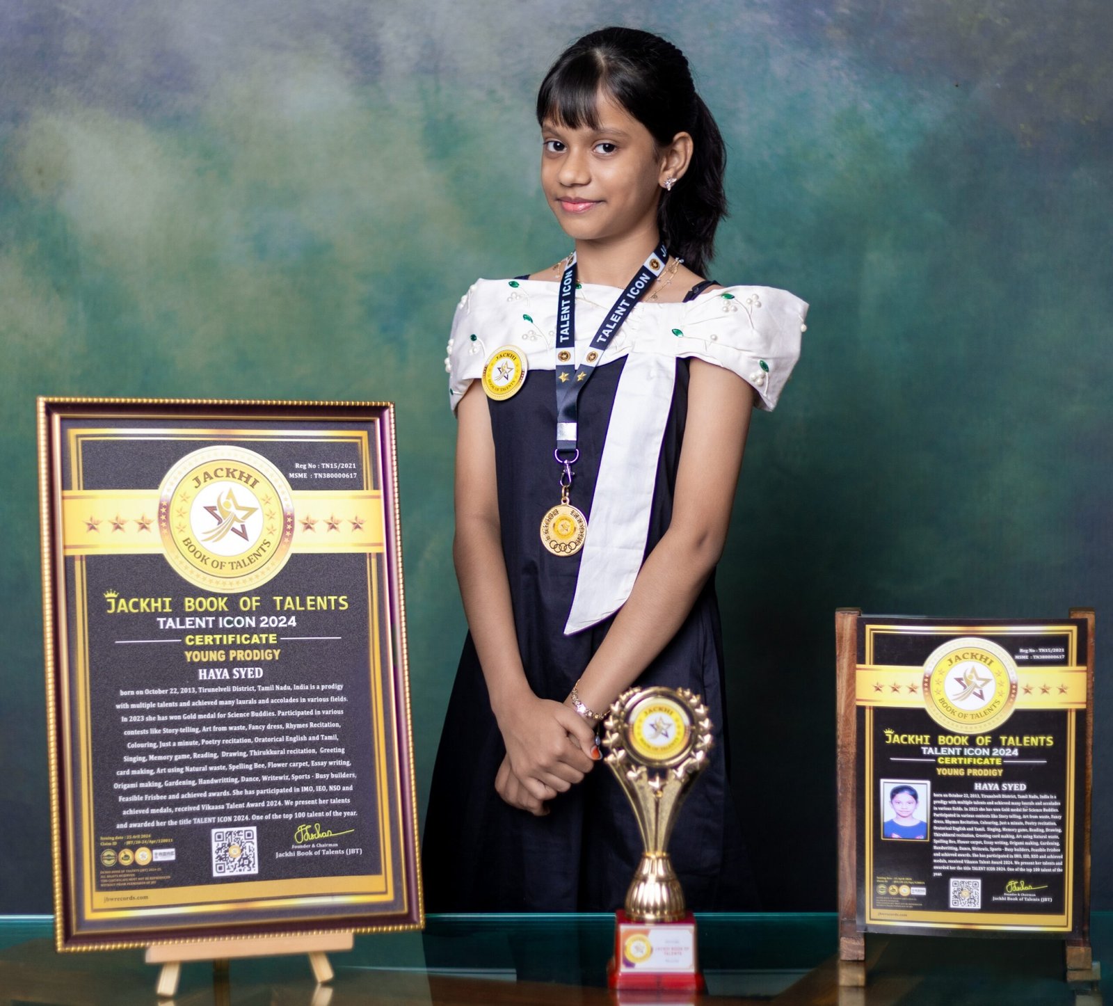 HAYA SYED, born on October 22, 2013,Tirunelveli District,Tamil Nadu, India is a prodigy with multiple talents and achieved many laurals and accolades in various fields. In 2023 she has won Gold medal for Science Buddies. Participated in various contests like Story telling, Art from waste, Fancy dress, Rhymes Recitation, Colouring, Just a minute, Poetry recitation, Oratorical English and Tamil, Singing, Memory game, Reading, Drawing, Thirukkural recitation, Greeting card making, Art using Natural waste, Spelling Bee, Flower carpet, Essay writing, Origami making, Gardening, Handwritting, Dance, Writewiz, Sports- Busy builders, Feasible Frisbee and achieved awards. She has participated in IMO, IEO, NSO and achieved medals, received Vikaasa Talent Award 2024. We present her talents and awarded her the title TALENT ICON 2024. One of the top 100 talent of the year.