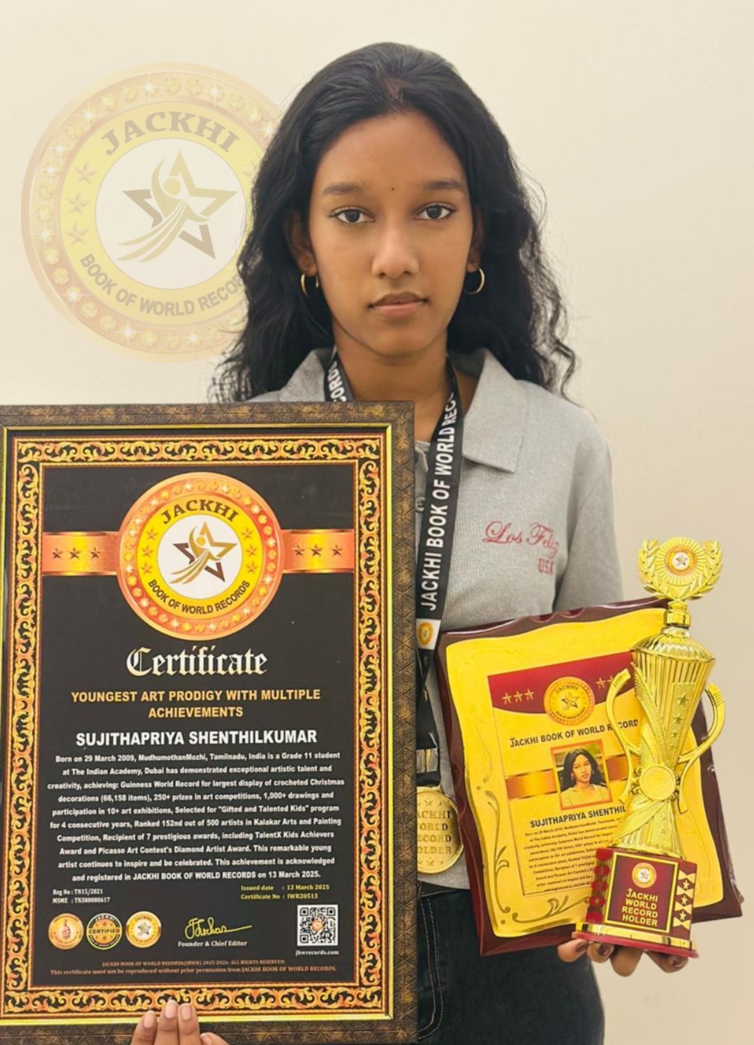 SUJITHAPRIYA SHENTHILKUMAR ,Born on 29 March 2009, MudhumothanMozhi, Tamilnadu, India is a Grade 11 student at The Indian Academy, Dubai. has demonstrated exceptional artistic talent and creativity, achieving: Guinness World Record for largest display of crocheted Christmas decorations (66,158 items), 250+ prizes in art competitions, 1,000+ drawings and participation in 10+ art exhibitions, Selected for "Gifted and Talented Kids" program for 4 consecutive years, Ranked 152nd out of 500 artists in Kalakar Arts and Painting Competition, Recipient of 7 prestigious awards, including TalentX Kids Achievers Award and Picasso Art Contest's Diamond Artist Award. This remarkable young artist continues to inspire and be celebrated.