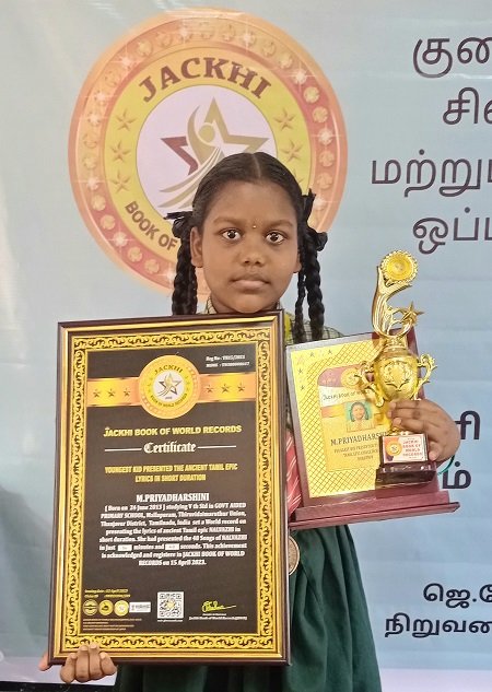 M.PRIYADHARSHINI ( Born on 24 June 2013 ) studying V th Std in GOVT AIDED PRIMARY SCHOOL, Mallapuram, Thiruvidaimaruthur Union, Thanjavur District, Tamilnadu, India set a World record on presenting the lyrics of ancient Tamil epic NALVAZHI in short duration. She had presented the 40 Songs of NALVAZHI in Just 04 minutes and 49 seconds.