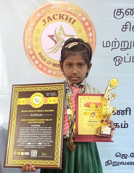 T.RETHISRI ( Born on 20 June 2015 ) studying III rd Std in GOVT AIDED PRIMARY SCHOOL, Mallapuram, Thiruvidaimaruthur Union, Thanjavur District, Tamilnadu, India set a World record on presenting the lyrics of ancient Tamil epic SILAPATHIGARAM' s Subdivision MADHURAIKAANDAM, VAZHAKKURAIKAATHAI, INIYAVAI NAARPATHU and Bharathiyar's AATHICHUDI in short duration. She had presented SILAPATHIGARAM's Subdivision MADHURAIKAANDAM, VAZHAKKURAIKAATHAI complete lyrics, INIYAVAI NAARPATHU ( Total 40 songs ), Bharathiyar's AATHICHUDI ( 110 lines ) in 09 minutes and 55 seconds.
