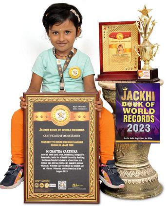 M.CHAITRA KARTHIKA, Born on 16th April 2020, Yelahanka, Bangalore, Karnataka, India Set a World Record by Reciting Maximum Sanskrit slokas in a least time in a tender age. She has recited 21 Sanskrit slokas within 03 Minutes 52 Seconds at the tender age of 3 Years 3 Months.
