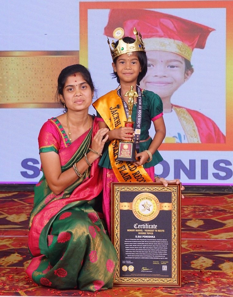 jbuser2025-06-03T13:40:00+05:30S.SAI PONISHKA, born on 19 September 2019, Palayamkottai, Tirunelveli district, Tamilnadu, India has demonstrated exceptional memory skills. She...