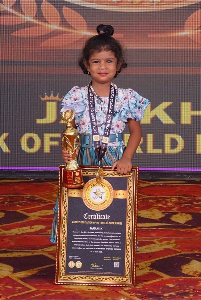 jbuser2025-05-25T11:43:29+05:30JANANI K, born on 31 May 2021, Karaikal, Puducherry, India, has demonstrated extraordinary memorization skills. She has successfully...
