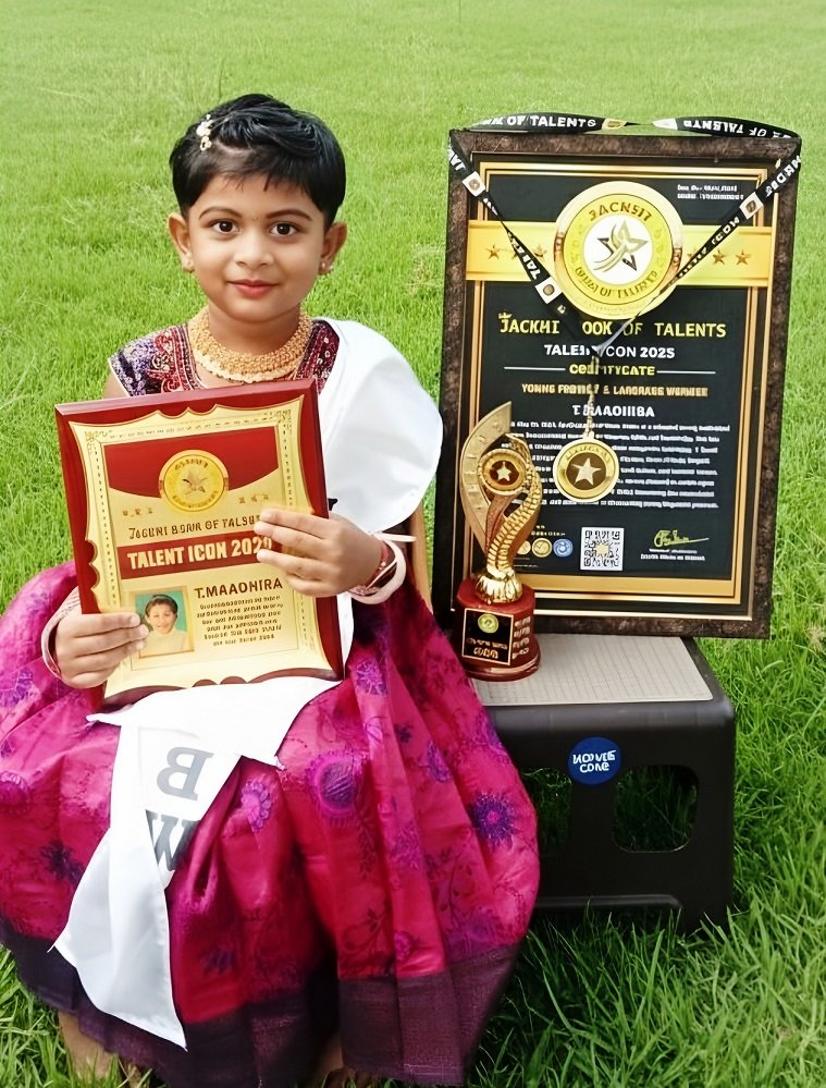 T.MAADHIRA, born on May 04, 2021, Madurai, Tamil Nadu, India, is a talented young individual who has demonstrated exceptional language skills and knowledge. She has excelled in identifying and reciting various categories, including: 5 Tamil rhymes, 6 English rhymes, and 4 Hindi rhymes, Parts of body, English Alphabets related to objects, Storytelling, Good habits, and Animals names. Recognizing her outstanding achievement, we are pleased to confer upon her the prestigious title of TALENT ICON 2025, honouring her remarkable talent, dedication, and contribution to showcasing young linguistic prowess.