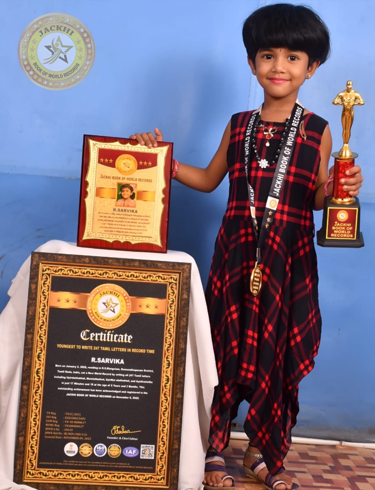 R. SARVIKA, born on January 2, 2020, and residing in R.S. Mangalam, Ramanathapuram district, Tamil Nadu, India, set a New World Record by writing all 247 Tamil letters—including Uyireluthukkal, Meieluthukkal, UyirMei eluthukkal, and Ayuthaeluthu—in just 17 minutes at the age of 5 years and 3 months.